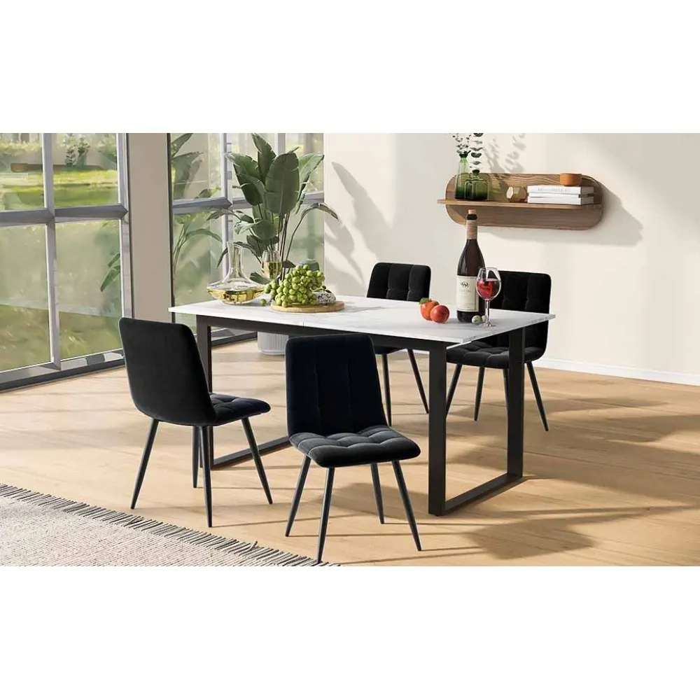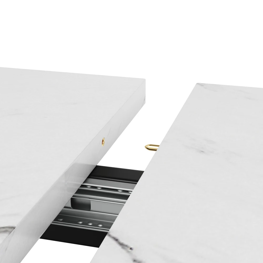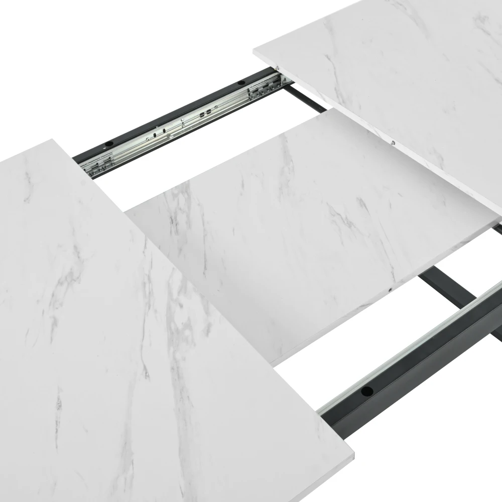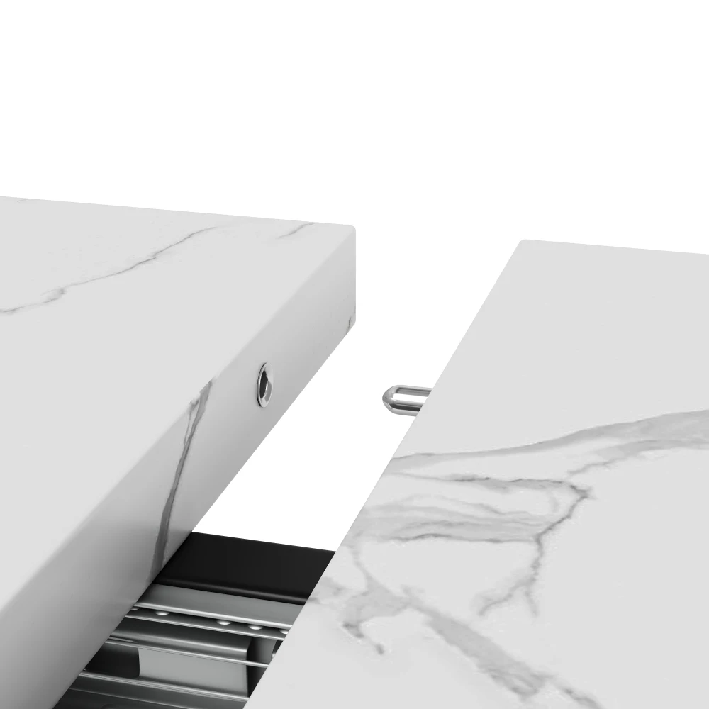 Cette table à manger allie élégance et praticité.Le plateau de table en matériau MDF marbré (avec motif marbré discontinu) est non seulement beau, mais également durable.Le design unique des pieds en fer en forme de croix donne à l’ensemble une touche moderne et une stabilité.Le plateau de table a une fonction télescopique, qui peut être rallongée de 120 cm à 160 cm selon les besoins, de sorte qu’il puisse être facilement adapté aux différents besoins d’espace et tailles de fête.Que ce soit pour les repas quotidiens en famille ou pour accueillir des amis, cette table à manger est parfaite pour apporter confort et style à votre maison.
