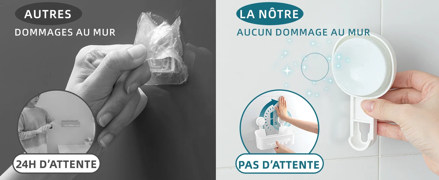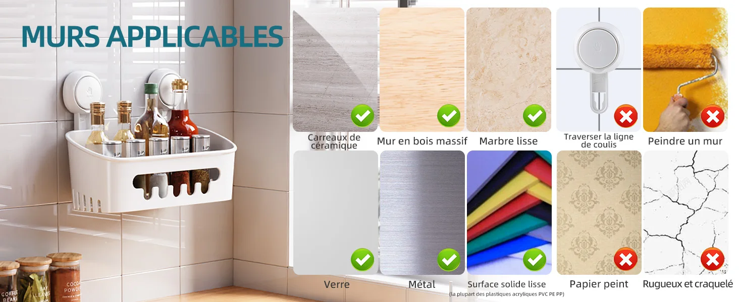 • Material durável e sucção forte: os cestos de chuveiro são feitos de material ABS espesso premium. Nossa ventosa baseada no princípio de sucção biônica de polvo é feita de material TPE. Cada prateleira de chuveiro de sucção com 2 ventosas comporta até 10 kg. A ventosa para chuveiro mantém estável e resistente ao tomar banho. Não instale as ventosas nas linhas de argamassa