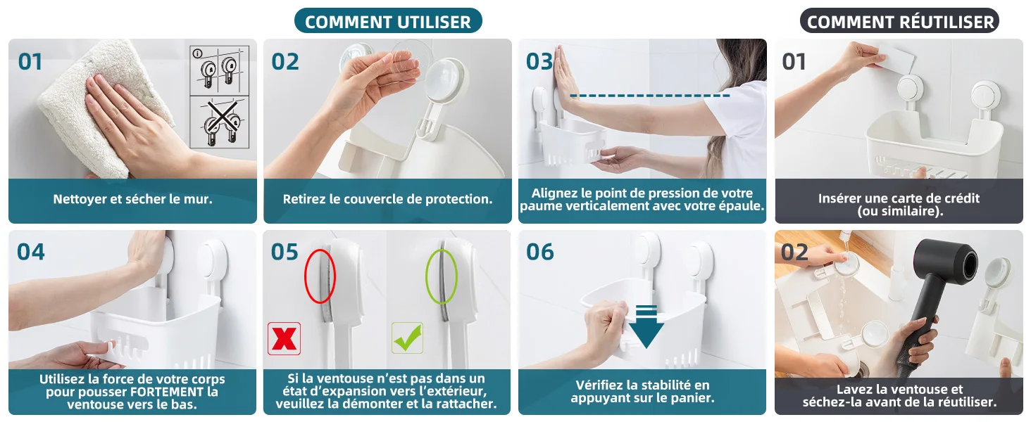 • Dicas: as ventosas são coladas apenas em superfícies lisas e não porosas como metal, vidro, azulejo, aço inoxidável e acrílico, mas não se aplicam a azulejos irregulares, placa de textura, mármore inacabado, papel de parede, parede pintada, etc. Se houver problemas na primeira instalação, lave a ventosa, seque com secador de cabelo e teste na superfície lisa de vidro. Se houver sucção, isso significa que a parede inicial pode não ser aplicável ao uso de ventosa, mude o local de instalação